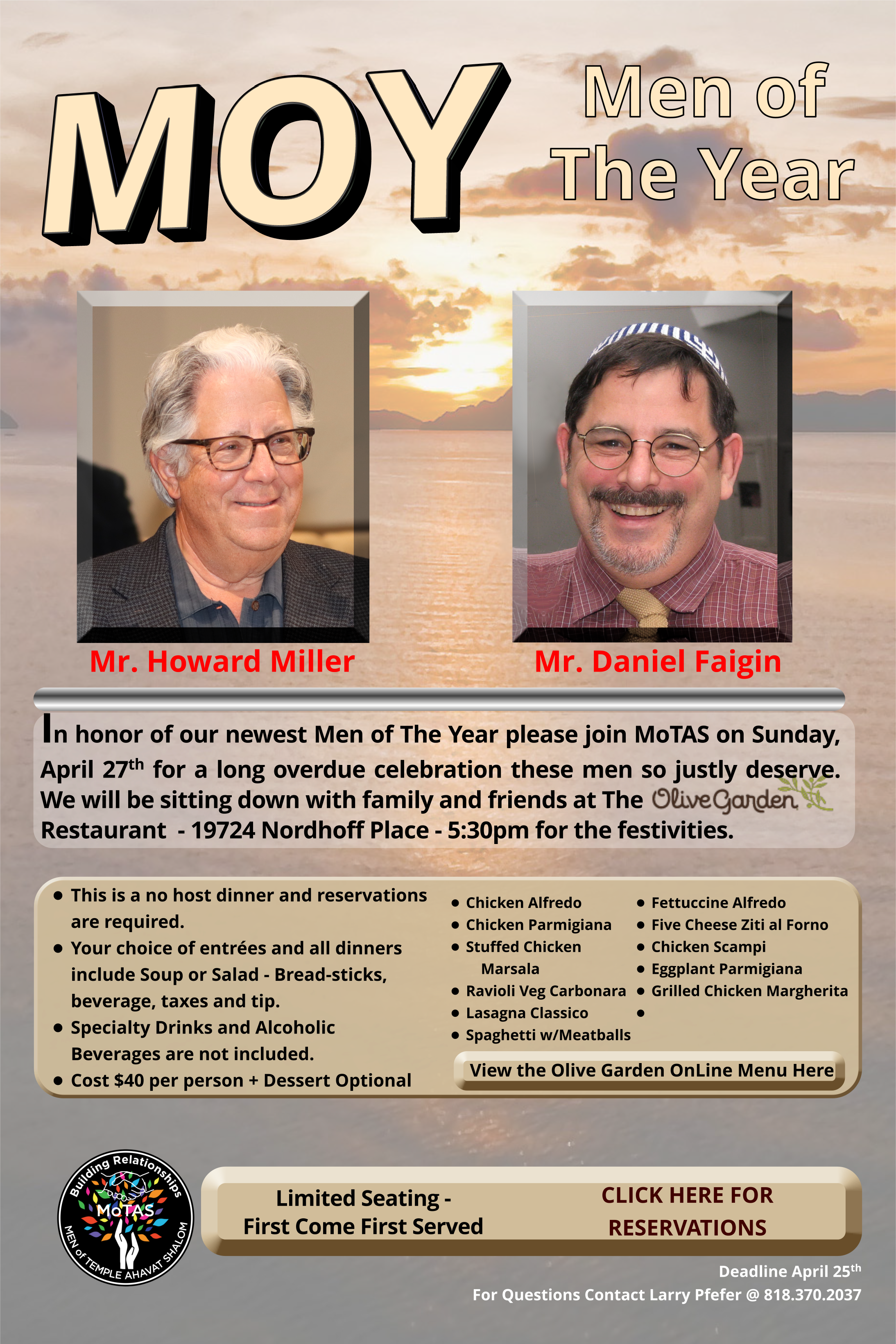As always, remember that the Men of Temple Ahavat Shalom is *your* organization. Keep up to date on our activities at http://www.tasnorthridge-motas.org/ and participate. Sign up for our action alert list at http://tinyurl.com/motas-action-alert. We want to serve all the men of Temple Ahavat Shalom and welcome new participants from the TAS membership. Join our Facebook group and “follow” our website. Come be part of the Men of Temple Ahavat Shalom!